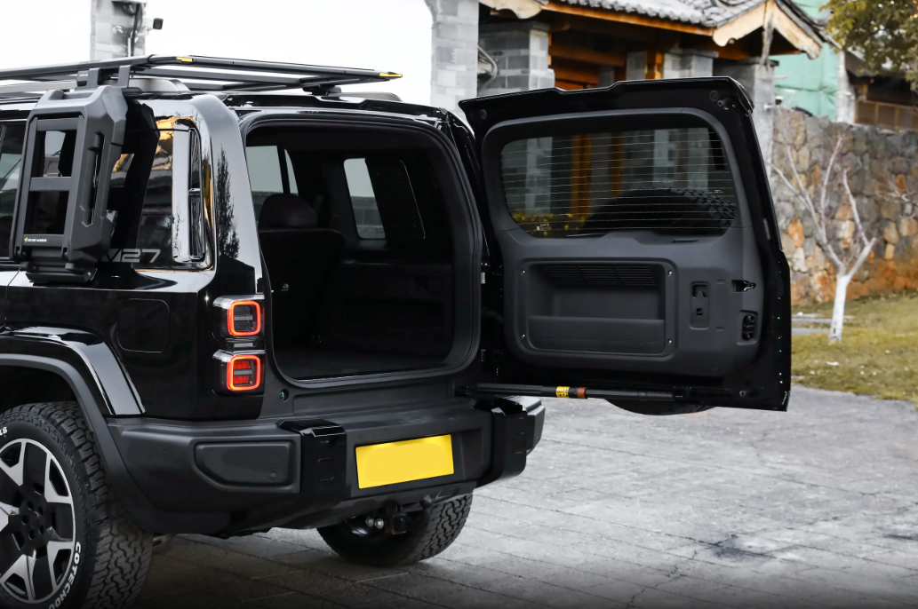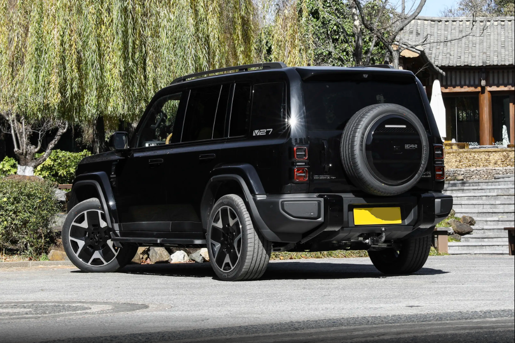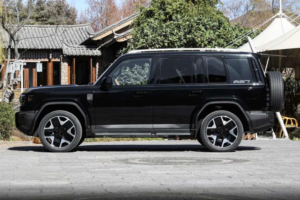 侧面更绝,平直腰线贯穿头尾,外扩的轮眉、原厂侧踏板、车顶行李架全配齐,不用后期改装就有内味儿。隐藏式门把手、D柱的V27专属标识,细节里藏着精致感。车尾的外挂式小书包备胎+侧开式尾门,是硬派SUV的灵魂,不管是停在路边还是自驾出游,回头率交高。