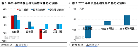 轮胎需求方面,卓创资讯认为四季度全钢轮胎总需求量预期较三季度呈现下滑趋势,降幅2.00%左右;但较去年同期及去年全年仍实现显著增长,全年增幅或在6.00%左右。这季节性波动主要源于市场需求结构的差异化表现:一方面,通常四季度为商用车生产企业的年度冲量阶段,轮胎配套市场需求支撑力度增强,为全年产销增长提供核心驱动;另一方面,替换及出口市场将逐渐进入传统淡季,尤其是出口市场在三季度高位后出现明显回落,拖累整体需求量。全年来看,四季度需求的结构性调整不影响全年增长趋势,配套市场的强劲表现及出口市场的前期增量共同形成全年产销的“双引擎”。