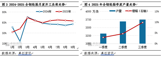 得益于出口市场增量效应逐渐显现,以及内销市场修复回调的共振,三季度全钢轮胎产能释放力度有所增强,月度开工逐月提升至7月的68.69%,较去年同期提升6.38个百分点。随后月份中假常规检修及假期放假行为时有发生,月度开工维持小幅调整为主,9月开工约为67.38%,较去年同期提升4.75个百分点。受此带动,三季度全钢轮胎累计产量约3745万条,同比增幅9.82%。