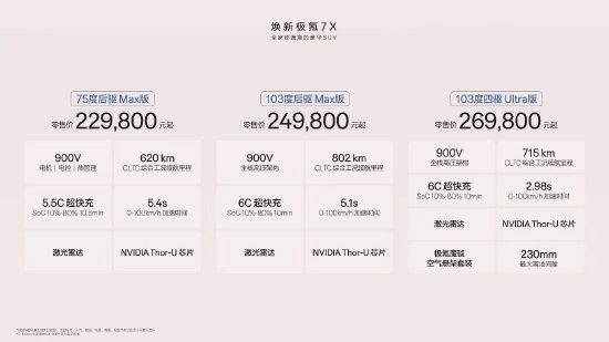 新浪科技讯 10月28日晚间消息,焕新极氪7X正式上市,定位家庭豪华SUV,新车共推75度后驱Max版 、103度后驱Max版、103度四驱Ultra版三款配置版型,官方零售价分别为229800元、249800元和269800元,超级置换权益后限时售价分别为219800元、239800元和259800元。