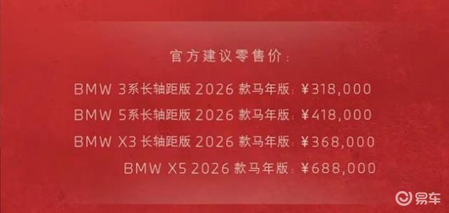 动力方面,2026款宝马3系长轴距马年版搭载2.0T涡轮增压发动机,最大功率245马力(180千瓦),最大扭矩400牛·米,0-100km/h加速6.3秒。2026款宝马5系长轴距马年版搭载2.0T涡轮增压发动机,最大功率258马力(190千瓦),最大扭矩400牛·米,0-100km/h加速6.5秒。