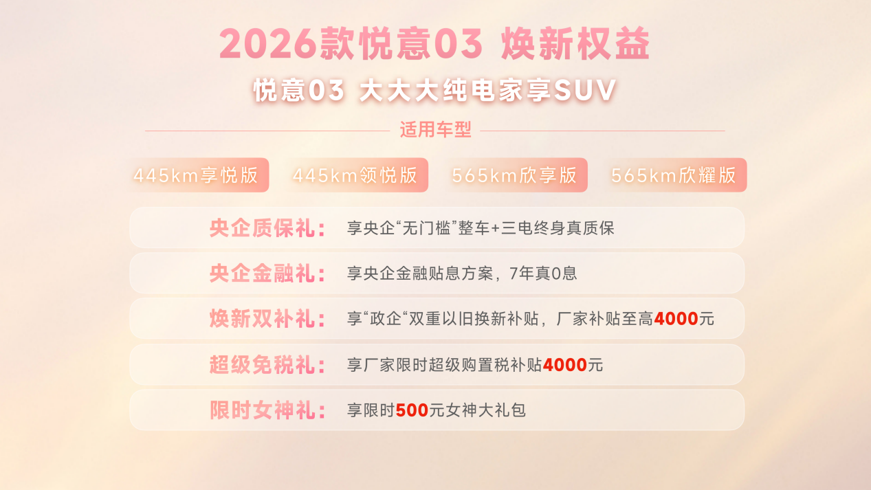 为了让更多年轻家庭轻松拥有高品质纯电生活,2026款悦意03上市之际推出央企五重礼遇,福利力度拉满。购车即可享无门槛整车及三电终身质保的央企质保礼,7年真0息的央企金融礼大幅降低购车门槛;同时可叠加政企双重以旧换新补贴至高4000元的焕新双补礼,限时4000元购置税补贴的超级免税礼,以及限时500元的开学/开工礼,还有限时半价升级价值4000元舒适选装包的专属福利,多重礼遇加持,让用户零负担开启纯电出行。