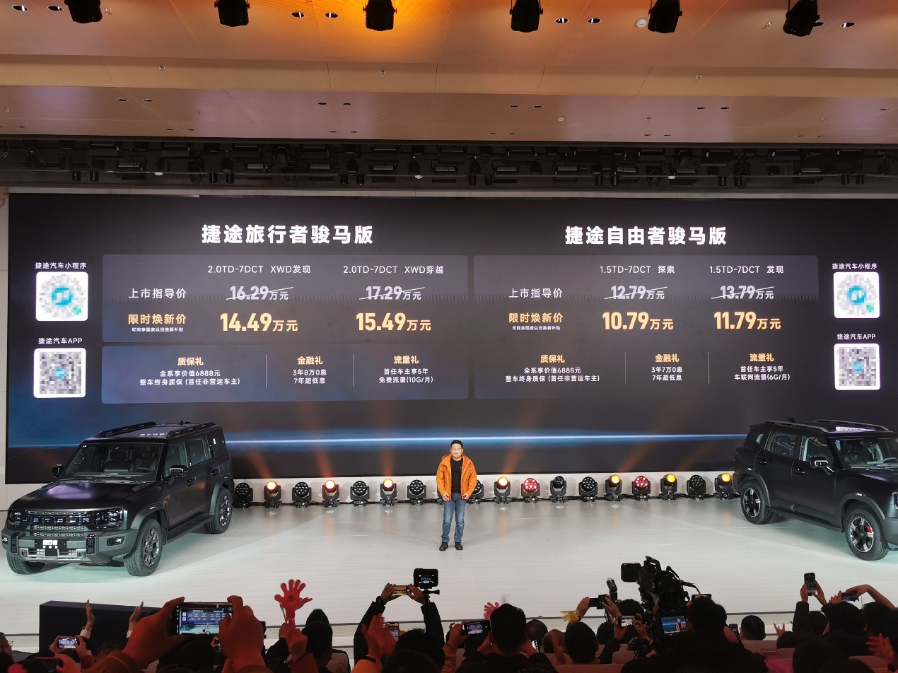 3月11日,捷途汽车旗下旅行者骏马版与自由者骏马版正式上市。其中,旅行者骏马版推出2.0TD-7DCT XWD发现、2.0TD-7DCT XWD穿越两款配置车型,官方指导价16.29万-17.29万元,限时焕新价14.49万-15.49万元;自由者骏马版推出1.5TD-7DCT探索、1.5TD-7DCT发现两款配置车型,官方指导价12.79万-13.79万元,限时焕新价10.79万-11.79万元。
