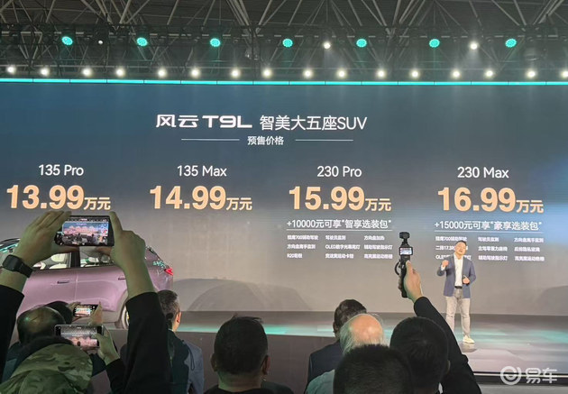 3月25日,定位“智美大五座SUV”的风云T9L正式开启预售,新车共推出4款车型,预售价格区间为13.99-16.99万元。这款承载着奇瑞新能源战略转型核心使命的车型,以2000公里综合续航、猎鹰700高阶智驾系统、鲲鹏超能电混CDM 6.0系统等核心优势,向15万元级市场发起冲击。